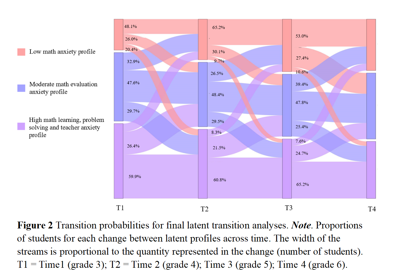 类别转变结果表明,高数学学习、问题解决和教师焦虑特征的稳定性随着时间的推移略有增加,高数学学习、问题解决和教师焦虑状况比低数学学习、问题解决和教师焦虑状况更有可能过渡到中等数学评价焦虑状况,中等数学评价焦虑状况的稳定性相对较低,低数学学习能力倾向在不同年级会表现出越来越大的稳定性,虽然高数学学习、a问题解决和教师焦虑状况的稳定性有所上升,但中等数学评价焦虑状况保持相对稳定,而低数学评价焦虑状况的稳定性在五年级之前有所上升,五到六年级时有所下降。