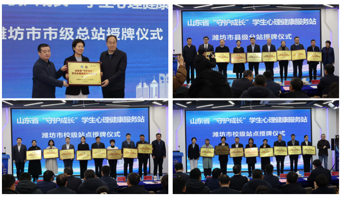 1月15日,“守护成长”山东省学生心理健康服务站建设工程在潍坊启动,潍坊市市级总站、县级分站、校级站点授牌启动仪式同时进行。山东省教育厅总督学王志刚,山东师范大学党委书记冯继康,潍坊市政府副市长陈端梅,潍坊市教育局党组书记、局长、潍坊市委教育工委常务副书记王霞,山东省泰山教育创新研究院院长王清林出席活动。揭牌仪式由山东师范大学党委副书记许双庆主持。