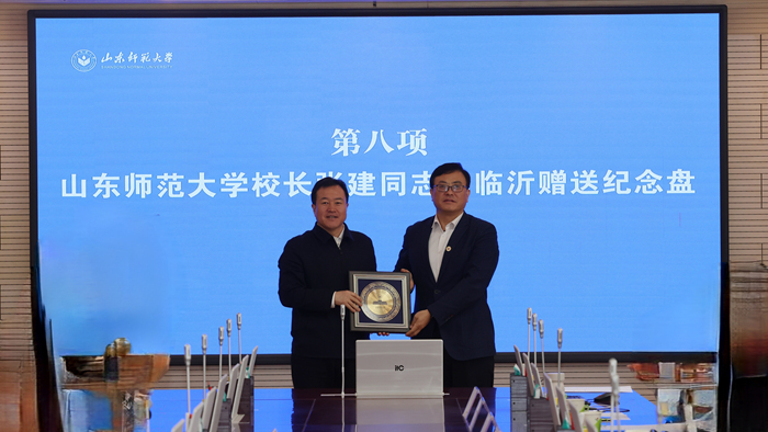 张建代表学校向临沂市委、市政府赠送山东师范大学纪念盘。