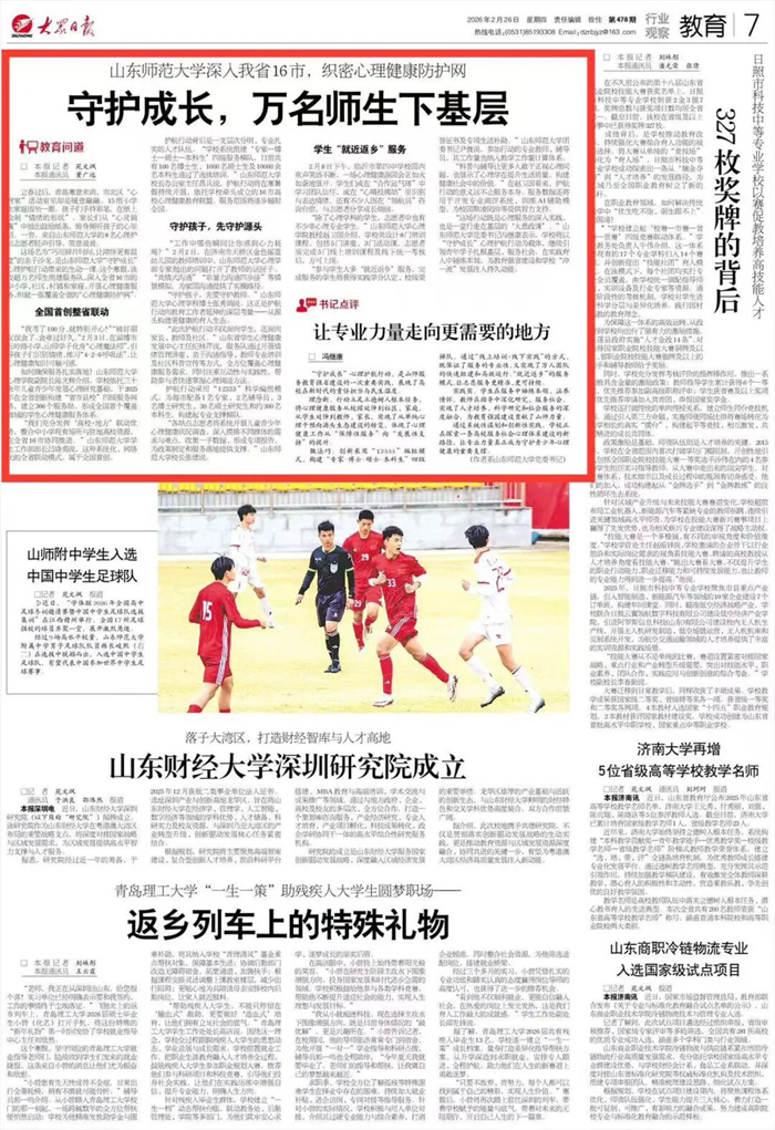 【编者按】2月26日,《大众日报》7版以《守护成长,万名师生下基层——山东师范大学深入我省16市,织密心理健康防护网》为题,报道山东师范大学在省教育厅牵头指导下,在全国首创整省联动模式,依托三十余年儿童青少年发展心理研究基础,创新构建“省市县校”四级服务网络,组建“专家—博士—硕士—本科生”四级服务梯队,组织万余名师生深入全省16市中小学、社区、村镇和家庭,开展心理健康服务,形成全国首个覆盖省域的学生心理健康服务体系的生动实践。“书记点评”栏目刊发校党委书记冯继康文章《让专业力量走向更需要的地方》,学校将持续发挥“高校+地方”联动优势,依托16市高校心理健康教育联盟,不断扩大服务辐射范围,为教育强省建设和“冲一流”发展注入持久动能。具体如下: